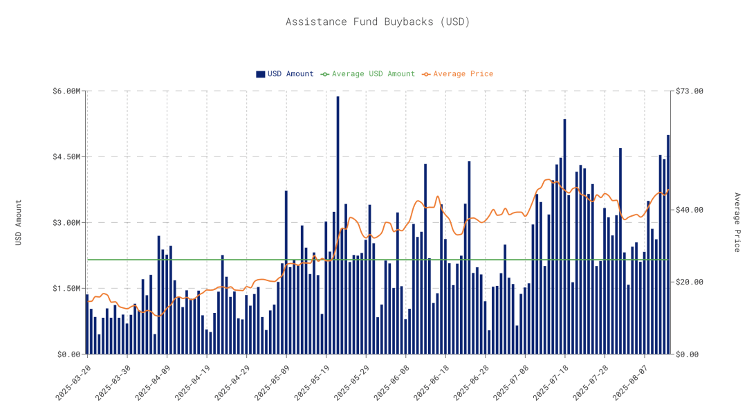 Assistance fund 主导的回购计划显示,目前已累计回购 2800 万枚 HYPE,资金来源于总收入的 54%(永续合约费用的 46% 分配给了 HLP 存款者,这意味着 92–97% 的总收入都返还给了用户),平均每日回购金额达 215 万美元。
