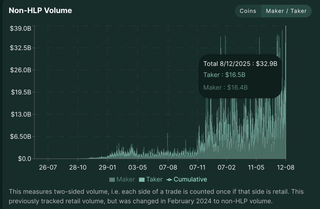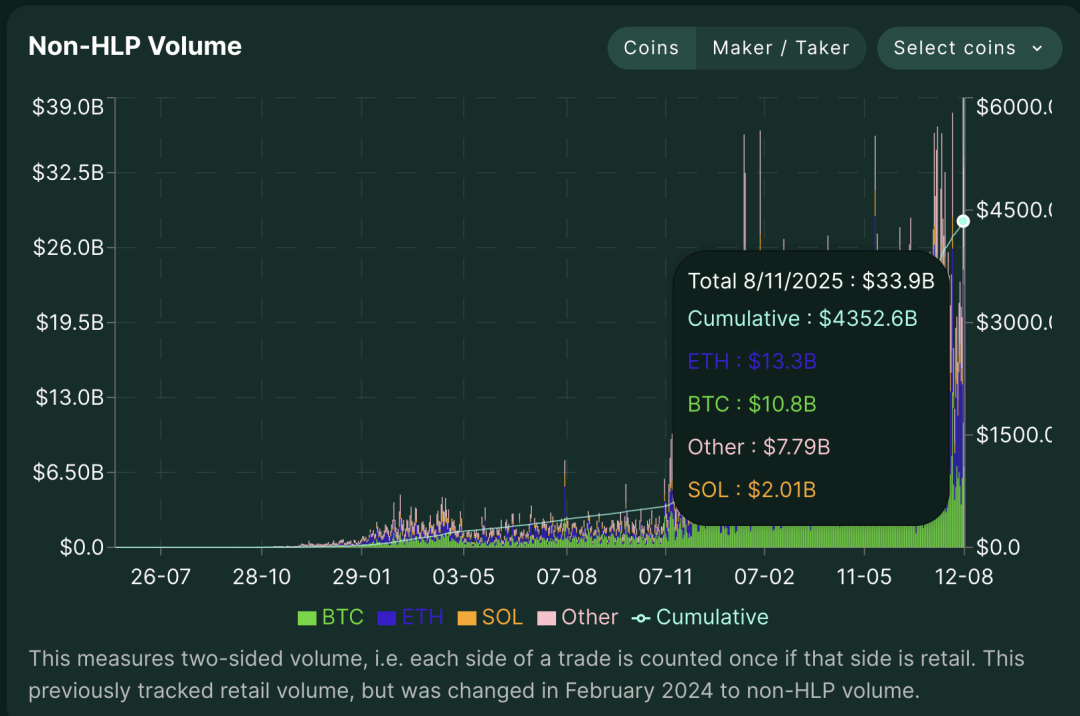 采用非 HLP 交易量指标(累计 4.3 万亿美元)来分析,由于 HLP 是被动流动性提供者/平台资金池,负责内部化订流和对冲风险,因此非 HLP 交易量代表了用户对用户(Peer-to-Peer)的交易流。需要留意的是,这部分用户间交易流仍包括: