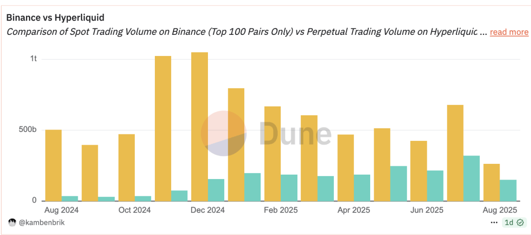 然而,将现货交易量与永续合约交易量直接比较,就像比较苹果和橘子。如果我们想要清晰区分币安(Binance)和Hyperliquid(HL)在现货与永续合约市场的实际份额,可以看到以下情况: