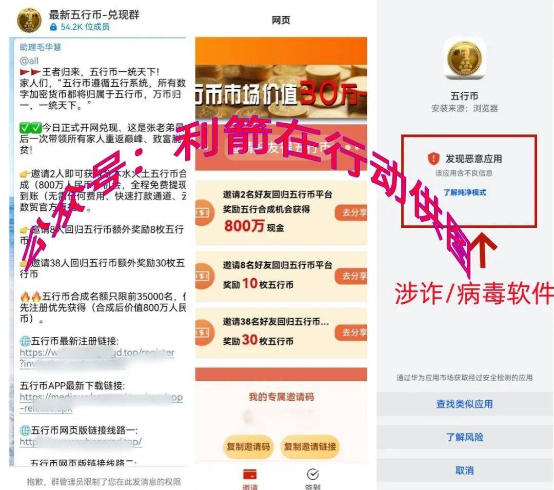 近期网络中出现了五行币APP,这是病毒软件,是“云数贸”诈骗项目之一,网站搭建在境外,该项目谎称“五行币真给力,上通天,下通地,干倒一切虚拟币..................邀请2人注册就能获得800万元人民币的机会,每天签到获得8万元人民币............”,编造电话号码就能注册的五行币APP,说明该APP是假的!