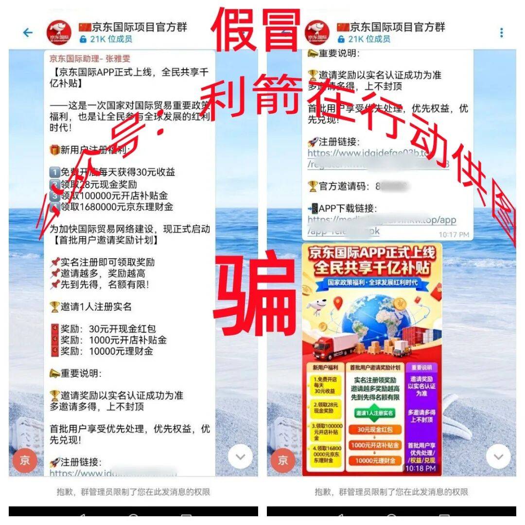 提醒:冒牌货“京东国际”APP是前期非法收集参与者信息,后期进行精准诈骗的虚假项目,请提高警惕,不要上当被骗。
