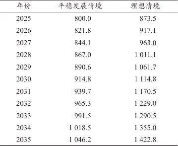 考虑就业人数的非线性增长态势,单一的指数增长数值无法较好地预测我国体育就业人数的未来趋势。因此,本研究通过设定不同的发展情景,考虑各情景下不同因素的组合变化,及其对就业产生的不同影响,从而得出不同发展情景下的就业预测结果。本研究设定了平稳发展情境和理想情境2种体育就业发展情境(表6),更加科学地预测我国体育就业发展的走势。平稳发展情境是根据到2025年我国体育产业总就业人数达到800万的目标值,计算2021—2025年的平均年增长率并进行预测。理想情境是结合我国目前体育产业发展整体情况,按估计增长率叠加的预测值。2019—2023年我国体育产业复合增长率为5.66%,同比就业增长率取5%。在既有目标下,在经济环境保持相对平稳、各项政策稳步推进、产业发展按既有合理节奏有序开展的情况下,预计到2035年,我国体育产业就业人数将有望达到1 046万,成为优化我国就业结构、助力经济高质量发展的重要力量。在更为理想的情况下,如果国家能够进一步加大对体育产业的政策倾斜力度,社会资本能够更加踊跃地投入体育产业的各个环节中,激发更多创新业态的涌现,使体育产业继续保持良好发展劲头乃至提质增速,我国体育产业就业人数将有望实现更大幅度的增长,预计到2035年将达到1 422万人,届时体育产业将在促进就业、提升全民健康水平以及带动关联产业协同发展等多个方面发挥更为突出且深远的作用。