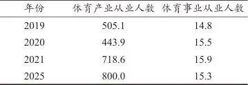 注:2019年和2025年体育产业从业人员数据来自《“十四五”体育发展规划》,其中2025年数据为目标值,2020年数据来自《第四次全国经济普查》,2021年数据来自《总结经验 把握机遇 凝心聚力 开拓创新——在新的起点上奋力推动体育产业高质量发展》。体育事业从业人数来自国家统计局统计的“体育系统人员数”。