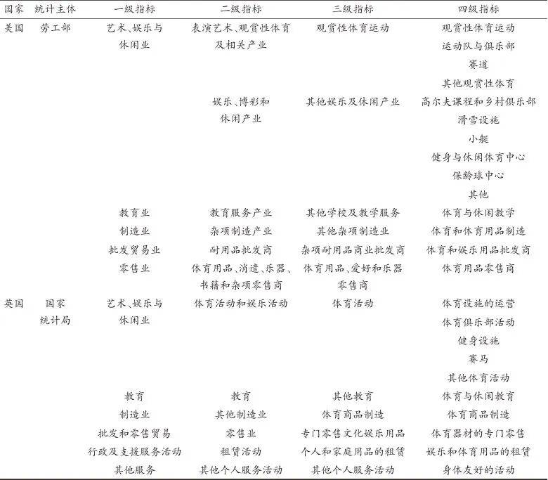 以“国家行业分类”为标准是指部分国家(国际组织)在体育就业统计预测以及衡量体育对于就业的促进效应时,主要依据国家(组织)现行或国际通用的行业分类标准进行统计。以美国、英国为代表的众多西方国家,将《所有经济活动的国际标准行业分类》作为基础,结合国家体育行业实际发展情况制定适应其国情的体育行业分类标准,并应用于体育就业统计与测算(表1)。